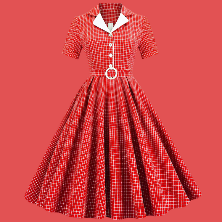 Robe rétro femme style 50s 60s 70s col V grande jupe fluide ceinturée à carreaux