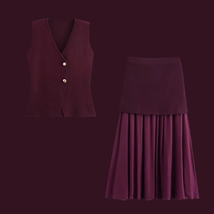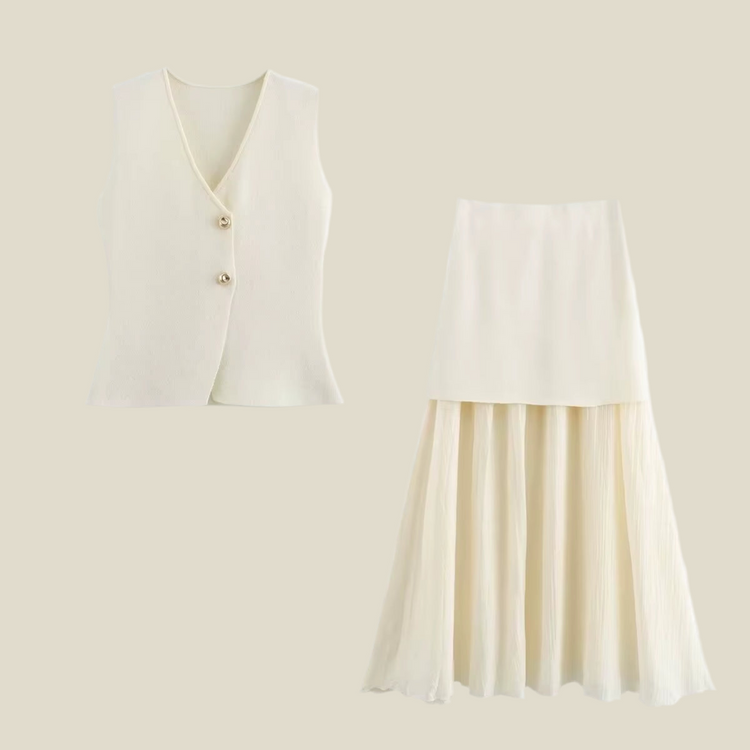 Ensemble Femme Été Gilet Tricoté Col V & Jupe Plissée Mi-Longue