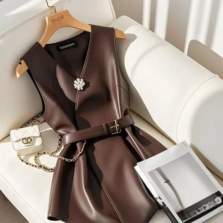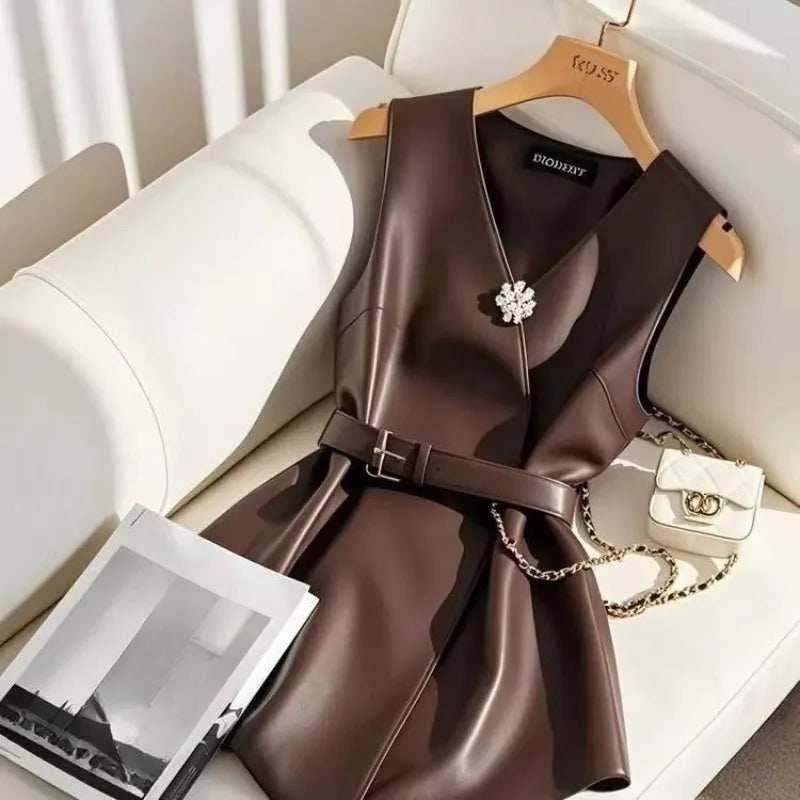 Gilet Blazer Femme Sans Manches en Similicuir Noir Élégance Britannique