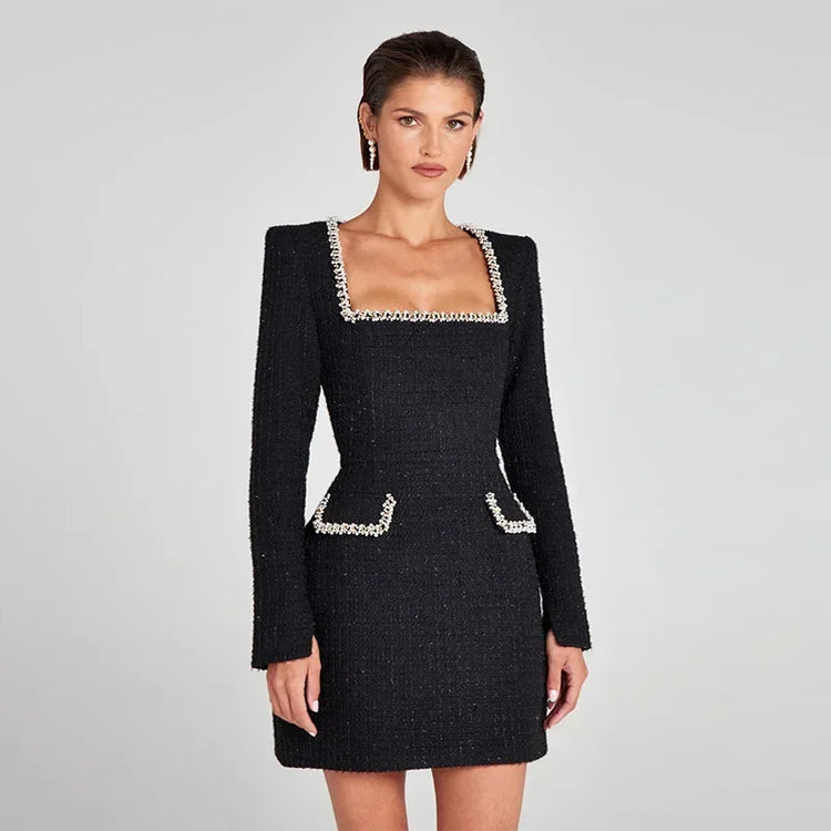 Robe Mini Élégante Femme Col Carré Clouté, Manches Longues