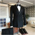 Voici un costume noir classique 2 pièces pour homme, parfait pour toutes les saisons. Il est conçu dans un style formel avec une veste croisée à double boutonnage et des revers en pointe (peaked lapel), très tendance pour les mariages, bals de promo ou cérémonies officielles.
