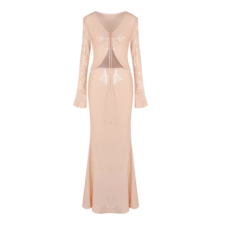 Adoptez une allure saisissante et raffinée avec cet ensemble deux pièces en sequins floraux, pensé pour sublimer vos plus belles occasions. Le haut à col en V et manches longues met en valeur le port de tête, tandis que la jupe longue à la cheville apporte grâce et fluidité à chacun de vos mouvements.